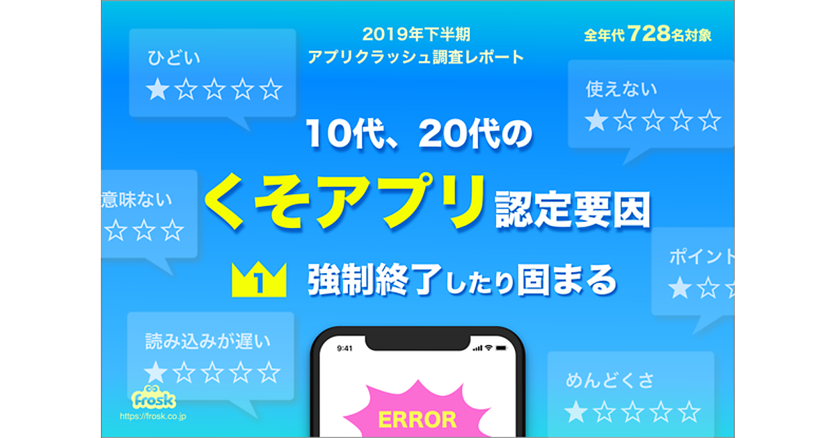 スマホアプリのエラー検知・分析ツール「SmartBeat」を提供するFROSKは、スマホアプリに関する調査結果(2019年下半期)を発表。アプリの利用頻度、ジャンル別の傾向、地域や年代などの傾向も合わせて調査し、特にひどいアプリ「クソアプリ」の要因を認定している。