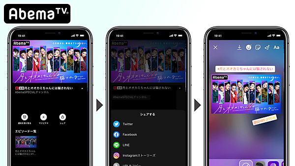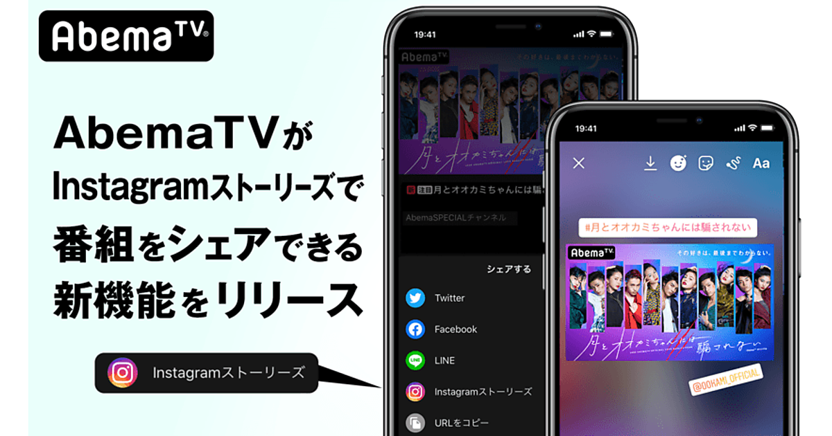 この新機能は「iOS」と「Android」向けのAbemaTVの最新版アプリで使える。番組のページに表示されるシェアボタンから「Instagram」アイコンを選択すると、Instagramストーリーズの編集画面に番組のカバーアートが追加され、簡単に投稿可能になる。テキスト、GIF、メンションなどを加えてから投稿することもできる。
