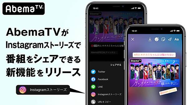 インターネット広告のサイバーエージェントやテレビ朝日などが出資するインターネットテレビ局のAbemaTV(アベマティーヴィー)は、ユーザーが好きな番組を「Instagram」の「Instagramストーリーズ」でシェアできる機能の提供を始めた、と3月24日発表した。気に入った番組をInstagramのフォロワーに知らせることができる。