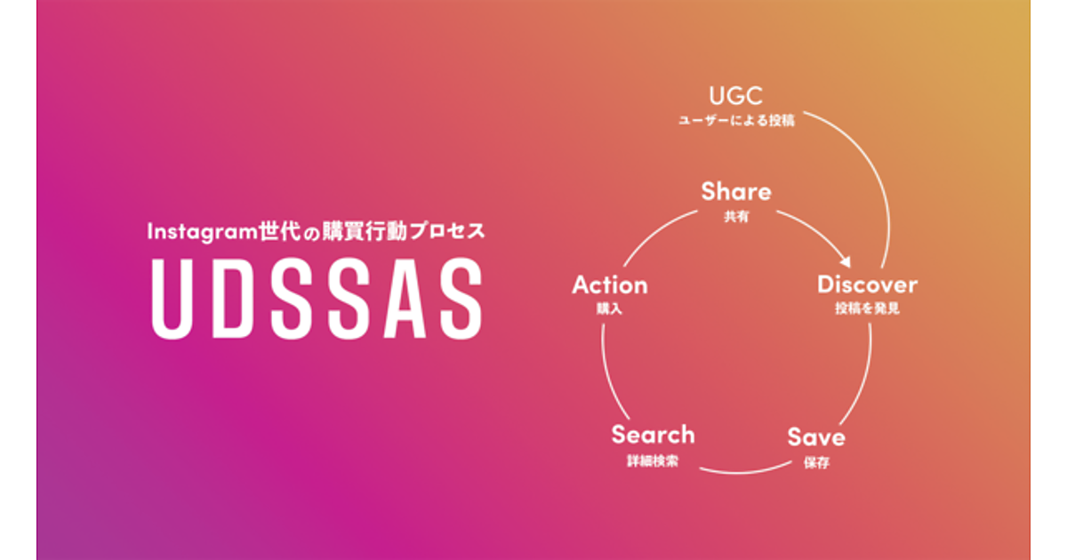 ホットリンクはInstagram世代に特有な購買行動プロセスを「UDSSAS(ウドサス)」と命名。「UGC(ユーザー投稿)」「Discover(投稿を発見)」「Save(保存)」「Search(詳細検索)」「Action(購入)」「Share(共有)」の頭文字を取ったもので、消費者投稿が起点のサイクルをうまく構築すれば、費用対効果の高いマーケティング活動ができる。
