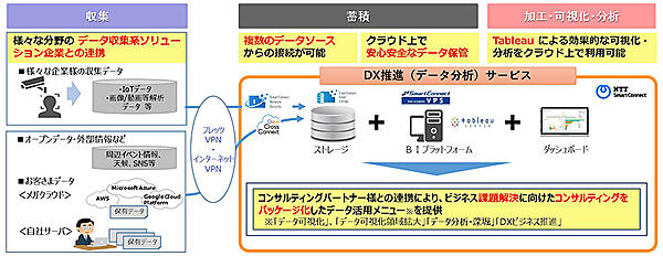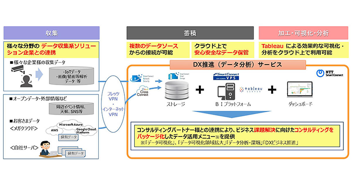 ハウジングやクラウド、ストリーミングサービスを展開しているNTTグループのNTTスマートコネクトは、データ収集や蓄積、加工、分析、可視化のパッケージ「SmartConnect DX推進(データ分析)サービス(仮称)」を始める、と3月30日に発表した。データ保管とビジュアル分析で定評のあるパートナー企業のサービスを組み合わせ、ワンストップで提供する。