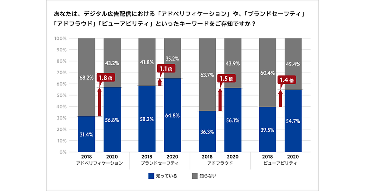 その結果、前回の2018年調査では「ブランドセーフティ」のみ、「知っている」という回答が半数を超えていたが、今回の2020年調査では、すべてのキーワードの認知が半数を超えた。とくに「アドベリフィケーション」の認知は、31.4%から56.8%と、1.8倍に増加した。