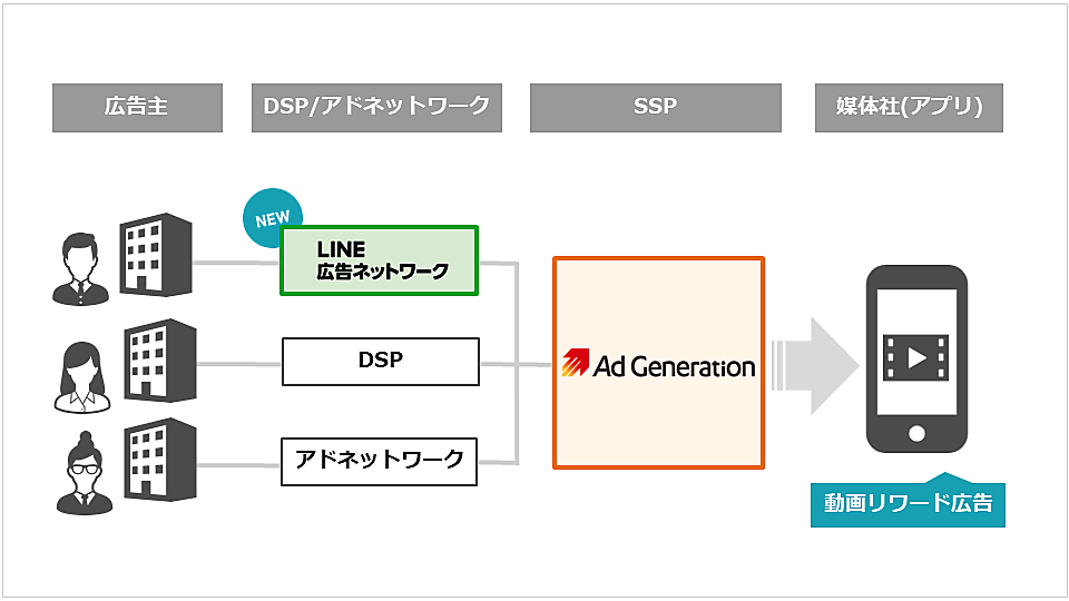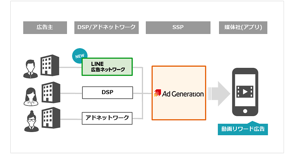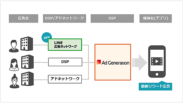 KDDIグループで広告事業のSupershipは、同社の媒体社向け広告配信プラットフォーム「Ad Generation(アドジェネ)」で、LINEの運用型広告配信プラットフォーム「LINE広告ネットワーク(旧LINE Ads Platform)」で提供される「動画リワード広告」フォーマットと接続を開始した、と3月31日に発表した。アドジェネを通じてLINEの動画リワード広告を自社媒体に配信できる。