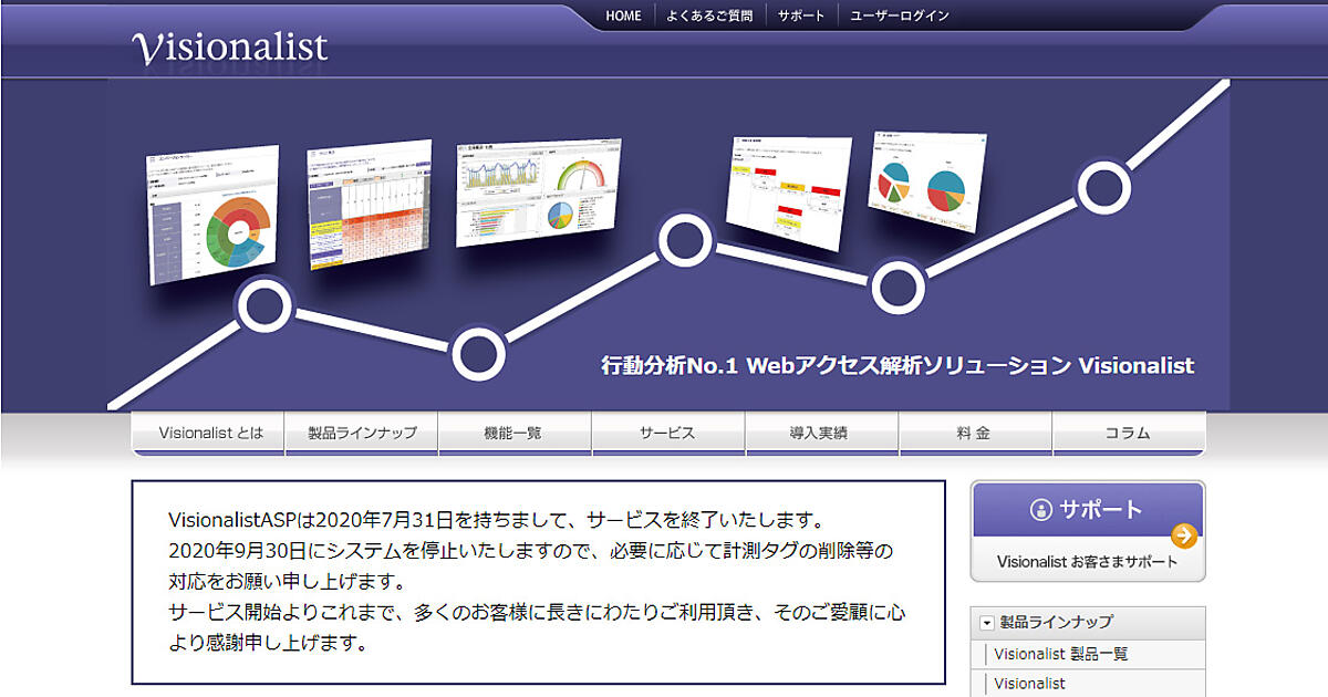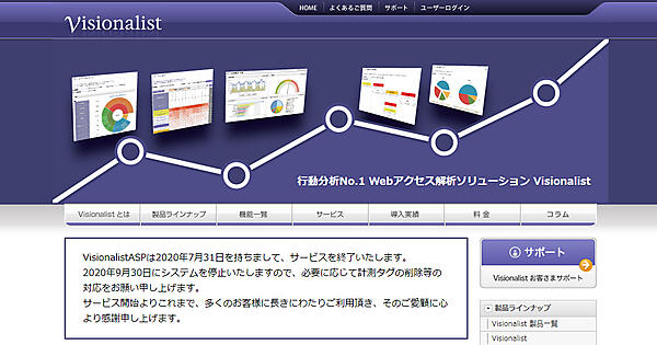 Visionalist(ビジョナリスト)ASPは、2020年7月31日でサービスを終了し、2020年9月30日にシステムを停止する。Visionalistの製品サービスサイトでは、「計測タグの削除等」を呼び掛けている。