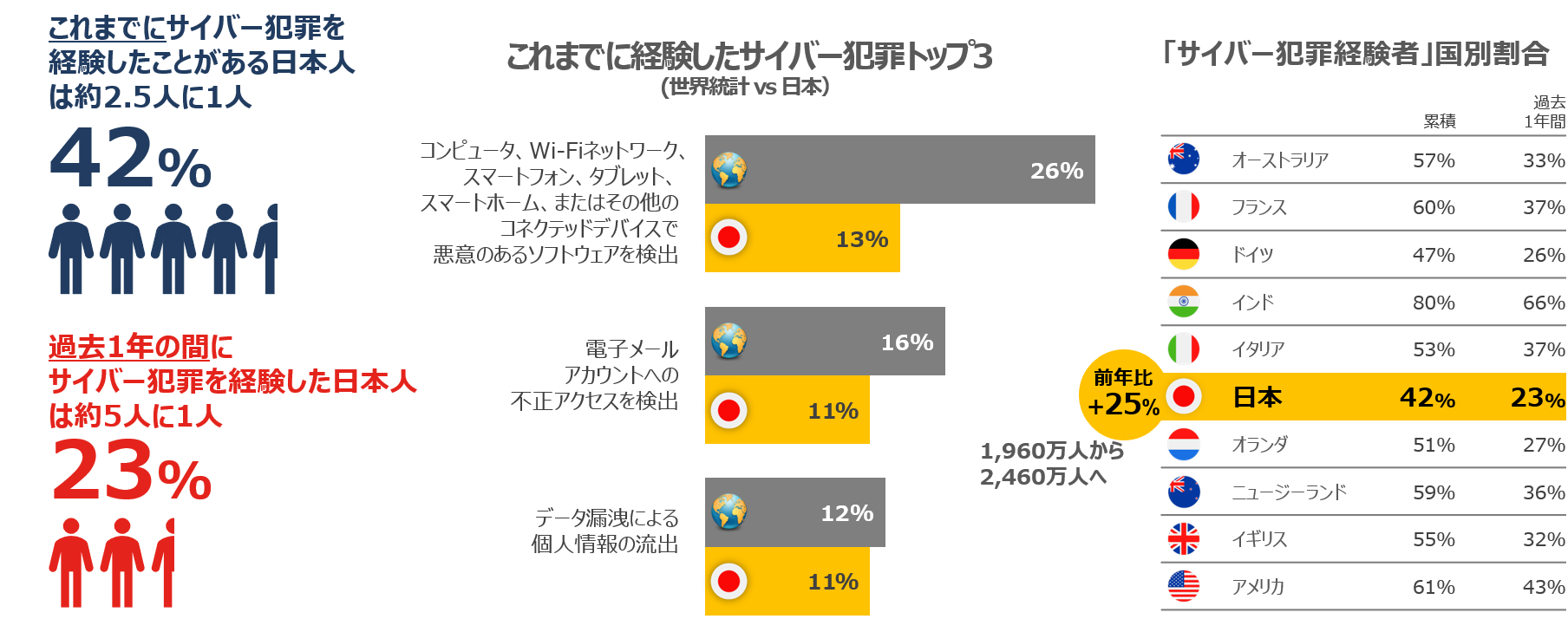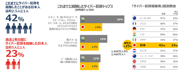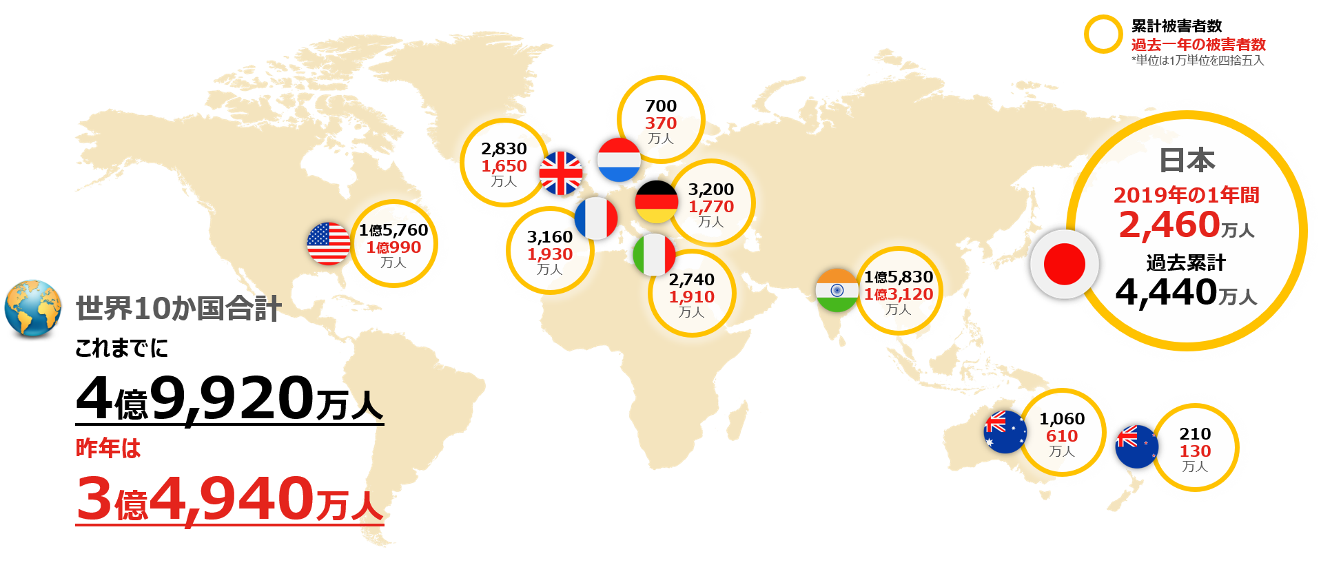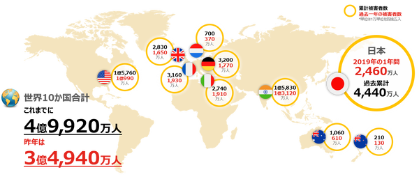それによると、サイバー犯罪の被害に遭ったことがある消費者は世界で約5億人、2019年だけで世界の約3億5千万人が被害に遭っている。日本人のサイバー犯罪被害者は累計で4,440万人。2019年の1年間では、サイバー犯罪被害を受けた日本の消費者は、2,460万人だった。これは前年2018年の1,960万人から約25%増となる。