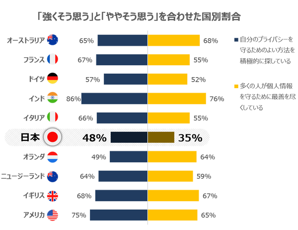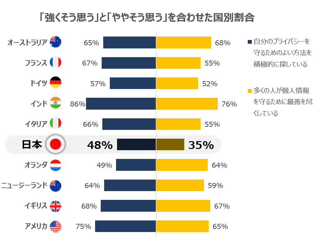 「自分のプライバシーを守る方法を積極的に探している」「多くの人が個人情報を守るために最善を尽くしている」についても10か国中でもっとも低く、日本人の消極的な態度が見える。