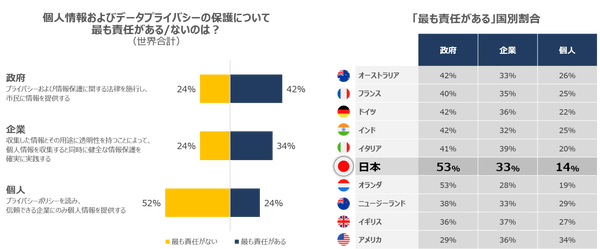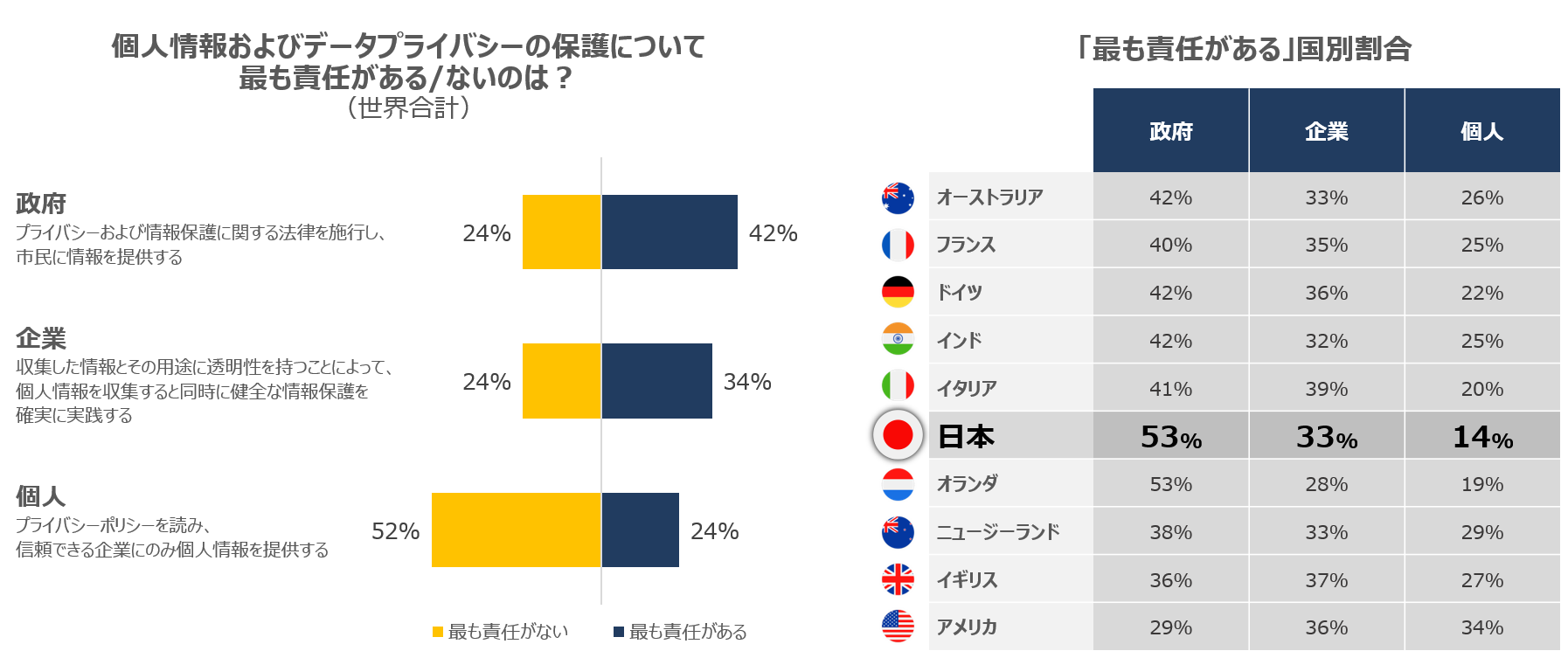 なお、プライバシーや個人情報保護の責任の所在を、政府・企業・個人の3つで聞いたところ、日本の消費者は「個人情報保護は政府にもっとも責任がある」53%が高く、オランダと並んで上位になった。