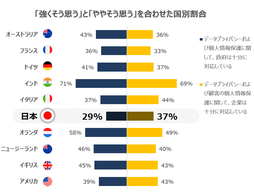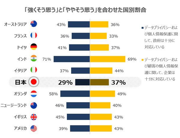 しかし「データプライバシーおよび個人情報保護に関して、政府は十分に対応している」29%と、やはり10か国中最下位で、政府に不満を持ちつつ対応できていないのが現状のようだ。