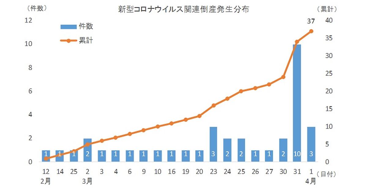 それによると、2020年4月3日(17時30分現在)の時点で判明している倒産企業は、全国で37件。法的整理が16件、事業停止が21件すでに発生しているという。