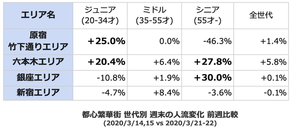 一方、前週との比較・年代別の比較では、原宿竹下通りエリアで20~34歳の来訪が、25.0%上昇。六本木エリアでは20~34歳が20.4%、55歳以上が27.8%上昇。さらに銀座エリアでは55歳以上が30.0%上昇と、いずれも急激に来訪者が増加している。六本木は全世代で見ても5.8%の増加だ。4月に入り東京で感染者が急増しているが、その原因として“夜の遊び”により拡大したと政府や都が指摘している。これらエリアへの外出増は、それを裏付けた形だ。