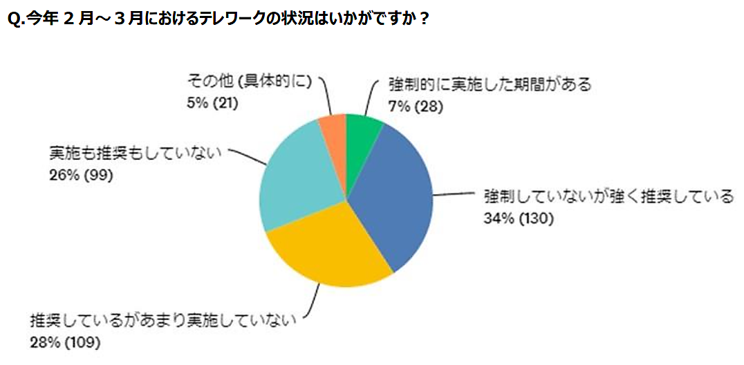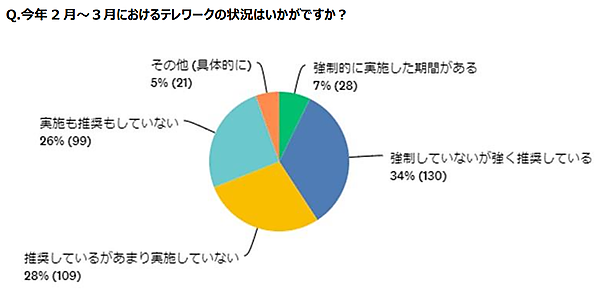 2~3月時点のテレワークの実施状況については、「強制的に実施」7%、「強制していないが強く推奨」34%、「推奨しているがあまり実施せず」28%、「実施も推奨もせず」26%、「その他」5%だった。