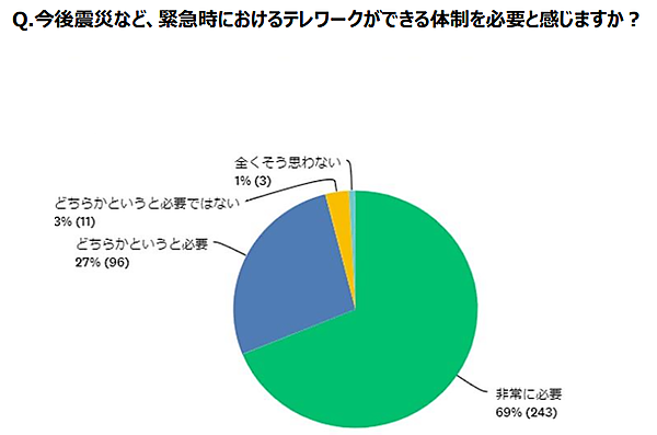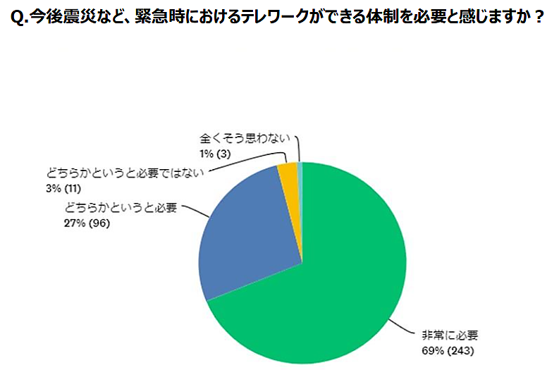 「今後、震災などの緊急時に備え、テレワークができる体制が必要か」と聞くと「非常に必要」69%、「どちらかというと必要」27%で、合計96%がテレワーク環境に積極的だった。