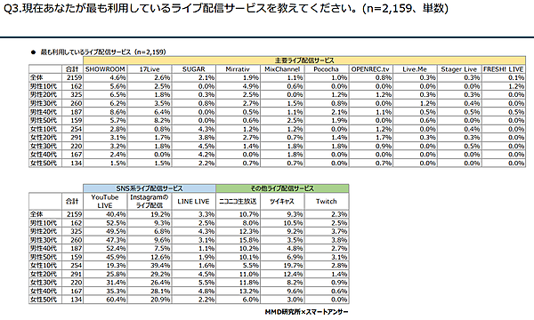 なおこの調査では、主要ライブ配信サービスとして「17Live」「SHOWROOM」「MixChannel」「Live.Me」「Mirrativ」「Pococha」「OPENREC.tv」「SUGAR」「FRESH! LIVE」「Stager Live」(10種)、SNS系ライブ配信サービスとして「YouTube LIVE」「Instagramのライブ配信」「LINE LIVE」(3種)、その他ライブ配信サービスとして「ニコニコ生放送」「ツイキャス」「Twitch」(3種)を採り上げている。