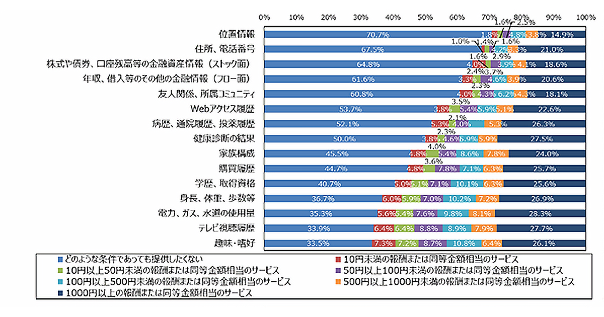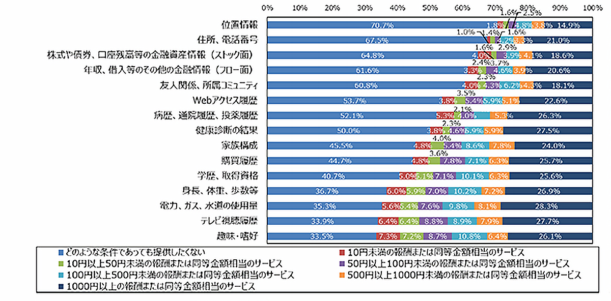 情報銀行に預けたパーソナルデータが第三者企業に提供される場合、対価が支払われることが想定されている。パーソナルデータには、「位置情報」「住所・電話番号」「金融情報」「友人関係」「身長・体重・歩数等」「電力・ガス・水道の使用量」「テレビ視聴履歴」「趣味・嗜好」など、さまざまなものが考えられるが、このうち「位置情報」については、「どのような条件(金額)であっても企業に提供したくない」と70.7%の消費者が回答している。以下「住所、電話番号」67.5%、「株式や債券、口座残高等の金融資産情報(ストック面)」64.8%なども拒否感が強い。