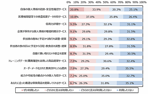 「パーソナルデータを活用したサービスとして、どういったサービスを利用したいか」を聞くと、「自身の個人情報の追跡・安全性確認サービス」54.7%が最多(ぜひ利用したい+どちらかと言えば利用したいの合計)。以下「医療機関間等での検査結果データ共有サービス」47.8%、「信用力評価サービス」36.8%が続いた。