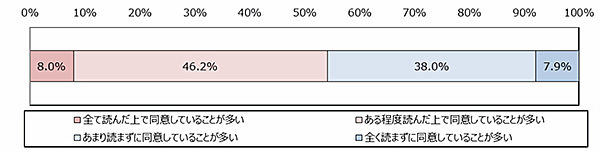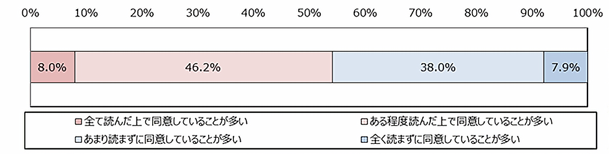 「“個人情報取扱に関する規約”について、同意前どれぐらい目を通しているか」を聞くと、「ある程度読んだ上で同意していることが多い」46.2%、「あまり読まずに同意していることが多い」38.0%、「すべて読んだ上で同意していることが多い」8.0%、「まったく読まずに同意していることが多い」7.9%と、やはり斜め読みの人が多い模様。