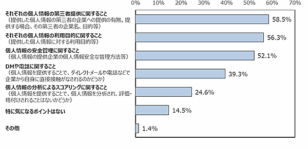 「個人情報の取扱に関して気になるポイント」を聞くと、「それぞれの個人情報の第三者提供に関すること」58.5%、「それぞれの個人情報の利用目的に関すること」56.3%、「個人情報の安全管理に関すること」52.1%が上位となった。