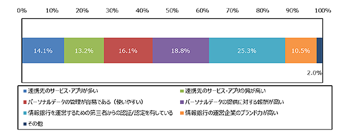 まず「情報銀行を選択する際の条件・機能」について聞くと、「情報銀行を運営するための第三者からの認証/認定を有している」25.3%、「パーソナルデータの提供に対する報酬が高い」18.8%、「パーソナルデータの管理が容易である(使いやすい)」16.1%、「連携先のサービス・アプリが多い」14.1%、「連携先のサービス・アプリの質が高い」13.2%、「情報銀行の運営企業のブランド力が高い」10.5%と分散した。全体的に報酬より安心を求めている傾向が伺える。