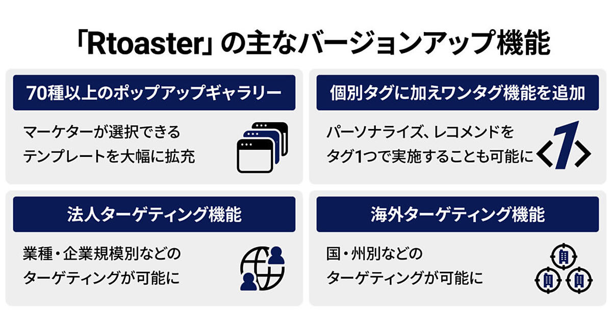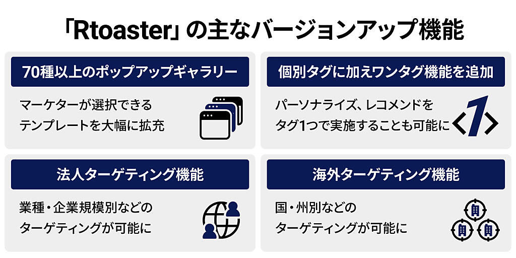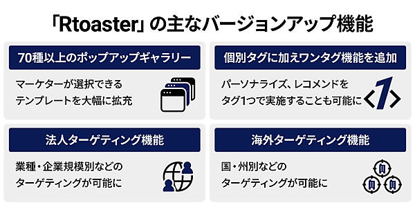 マーケティング担当者は、顧客体験(CX)向上の施策の運用に関わる時間が膨大となり、IT技術の進歩のキャッチアップに知識やリテラシーが求められるなど負荷が高まっている。Rtoasterのバージョンアップは、担当者の熟練度や属人的スキルに左右されず、新任者から熟練者までRtoasterの機能を十分に活用できることを目的に新機能を実装した。