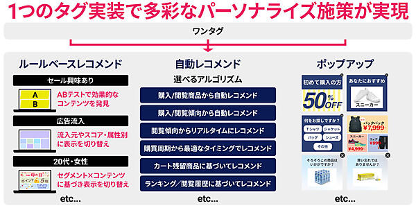 レコメンドのポップアップはテンプレートを70種類以上に拡充。実装結果を視覚的にイメージできるデザインライブラリーから選べる。バナー▽自動▽ポップアップの各レコメンドをひとつのタグで実装する「ワンタグ機能」を開発し、コンテンツ表示を速くするなら個別タグで、運用担当者の負荷軽減ならワンタグでと個別タグとワンタグの併用ができる。