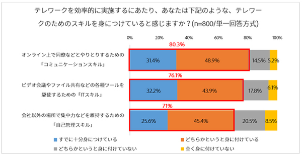 まず、「テレワークを効率的に実施するにあたり、どういったテレワーク関連のスキルを身に付けているか」を聞くと、オンライン上で同僚などとやりとりするための「コミュニケーションスキル」が80.3%、ビデオ会議やファイル共有などの各種ツールを駆使するための「ITスキル」が76.1%、会社以外の場所で集中力などを維持するための「自己管理スキル」が71.0%と、総じて高い。