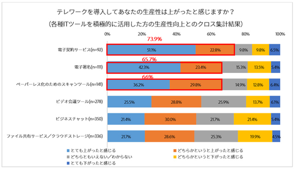 さらに具体的に、利用したITスキルごとに「生産性が上がった」と感じたものを聞くと、「電子契約サービス」「電子署名」「スキャンツール」などを積極的に利用している人ほど、生産性の向上を実感していた。ビデオ会議やビジネスチャット以上に、これらツールのスキルがテレワークで有用とも言えるだろう。