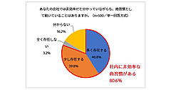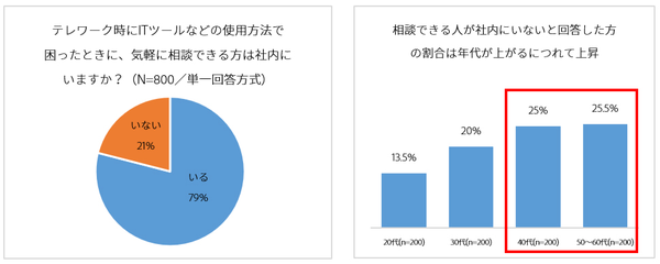 一方「テレワーク時にITツールなどの使い方で困ったときに、気軽に相談できる人が社内にいるかどうか」を聞くと、全体の21%は「いない」と回答。これを年代別で見ると、年齢層があがるほど割合が上昇する。とくに40代以上は、40代:25%、50代:25.5%と全体平均を超える。あらためてITスキルの世代間格差が浮き彫りになったと言えるだろう。