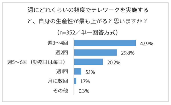 なお、「テレワークで生産性が上がった」と回答した352名に、「生産性がもっとも上がると思うテレワークの頻度」を聞くと、「週3~4回」42.9%、「週2回」29.8%、「週5~6回(勤務日は毎日)」20.2%となり、全面テレワークまではいかないが、通常勤務よりテレワークのほうが支持されている結果となった。