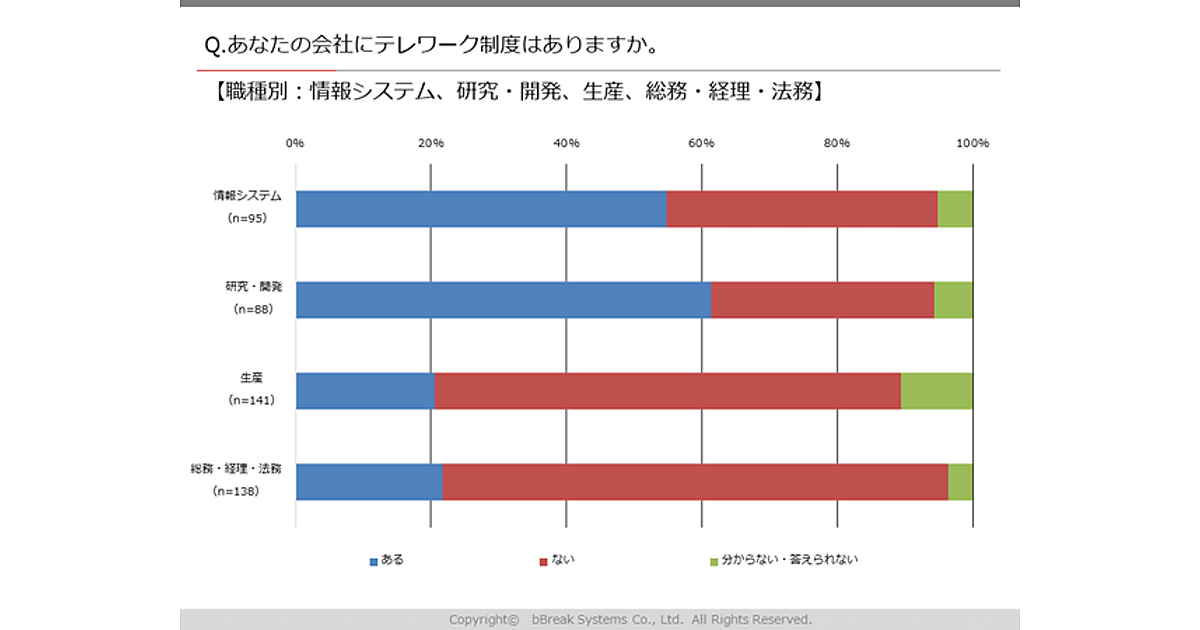 まず自社のテレワーク制度の有無を聞くと、「ある」32.0%、「ない」61.5%、「分からない・答えられない」6.5%だった。「ある」との回答がもっとも多かった業種は「IT業」で7割近く。一方もっとも少なかった「卸・小売業」は2割に留まっている。職種別では「情報システム」「研究開発」が多く、「生産」「総務・経理・法務」は少なかった。