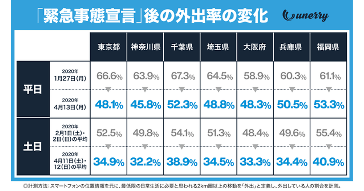 unerryは、4月7日の緊急事態宣言が「外出自粛」に与えた影響について、分析結果を発表した。東京都の平日における外出先についても、詳細調査を実施している。