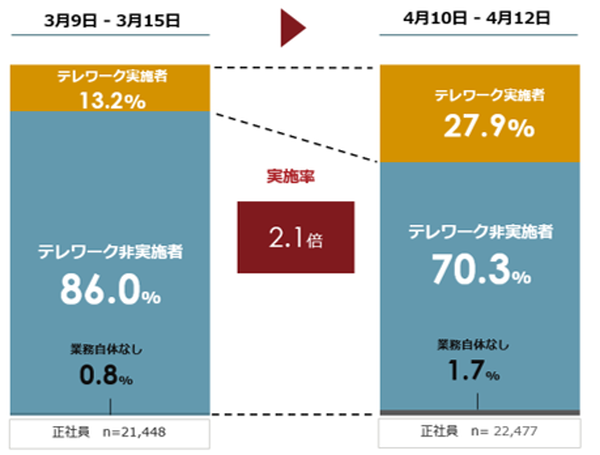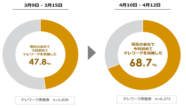 調査によると、「緊急事態宣言後の正社員のテレワーク実施率」は、平均27.9%で、前回調査の13.2%から、1か月で倍以上に増加した。7都府県とそれ以外で比較すると、7都府県は38.8%、それ以外の地域は13.8%だった。「テレワークを初めて実施した」という人は68.7%。前回調査で47.8%だったが、そこで未体験だった人たちの多くが「初めてのテレワーク」を体験したこととなる。