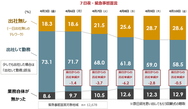 7都府県における出社状況の推移を、「出社無し(1日中テレワーク)」「出社して勤務(一部でも出社した場合)」「業務自体が無かった」の3パターンで見ると、「出社して勤務」とした人の割合(出社率)は、4月8日(緊急事態宣言の翌日)でもは61.8%と、前日の7日(68.0%)から6.2ポイントしか減っていなかった。4月10日時点でも58.5%が出社しており、政府が目指した「7割減」は難しい現状が明らかとなった。