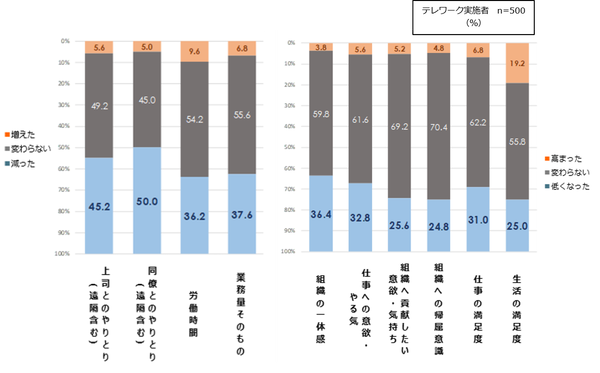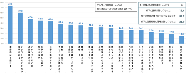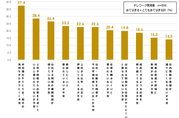 続いて、テレワークを行っている人(n=500)に「不安・課題・変化」を聞いた。まずテレワークの「不安」としては、1位「相手の気持ちが分かりにくい」37.4%、2位「仕事をさぼっていると思われないか」28.4%、3位「出社する同僚の業務負担の増加」26.4%が上位だった。