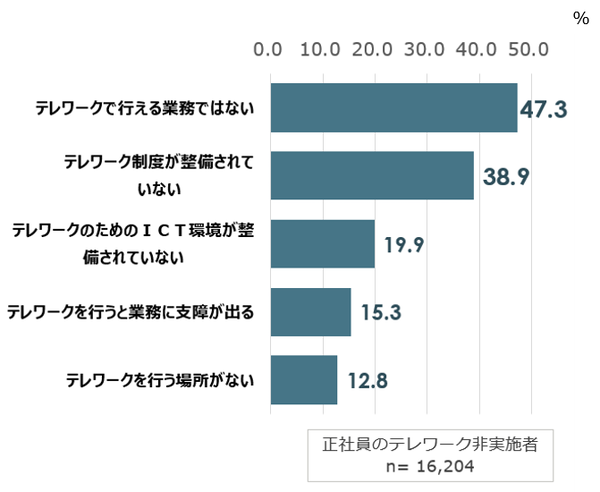 逆に「テレワークができない理由」を企業に聞くと、「テレワークで行える業務ではない」47.3%(前回:39.5%)、「テレワーク制度が整備されていない」38.9%(前回:41.1%)となり、前回から順位が入れ替わっており、じょじょにではあるが整備が進んでいる様子がうかがえる。「新型コロナが収束した後もテレワークを続けたい」という意見は53.2%と半数を超えており、ひきつづき業務スタイル変革の課題になるだろう。