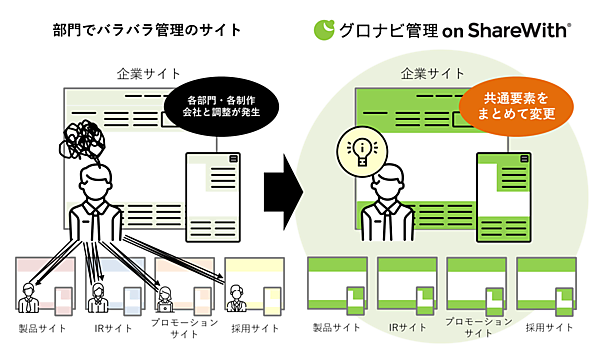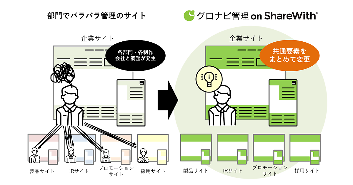 企業サイトは、広報▽IR▽採用▽製品サービス部門など複数の部門にまたがり、各部門が別々の制作会社に更新を委託する複雑な運営体制になりがち。サイトの共通要素の修正はCMSによる全体管理が及びにくく、社内外への依頼・調整、確認の煩雑な作業が必要だった。グロナビ管理は、サイト管理者のこうした重い負担を解消する。
