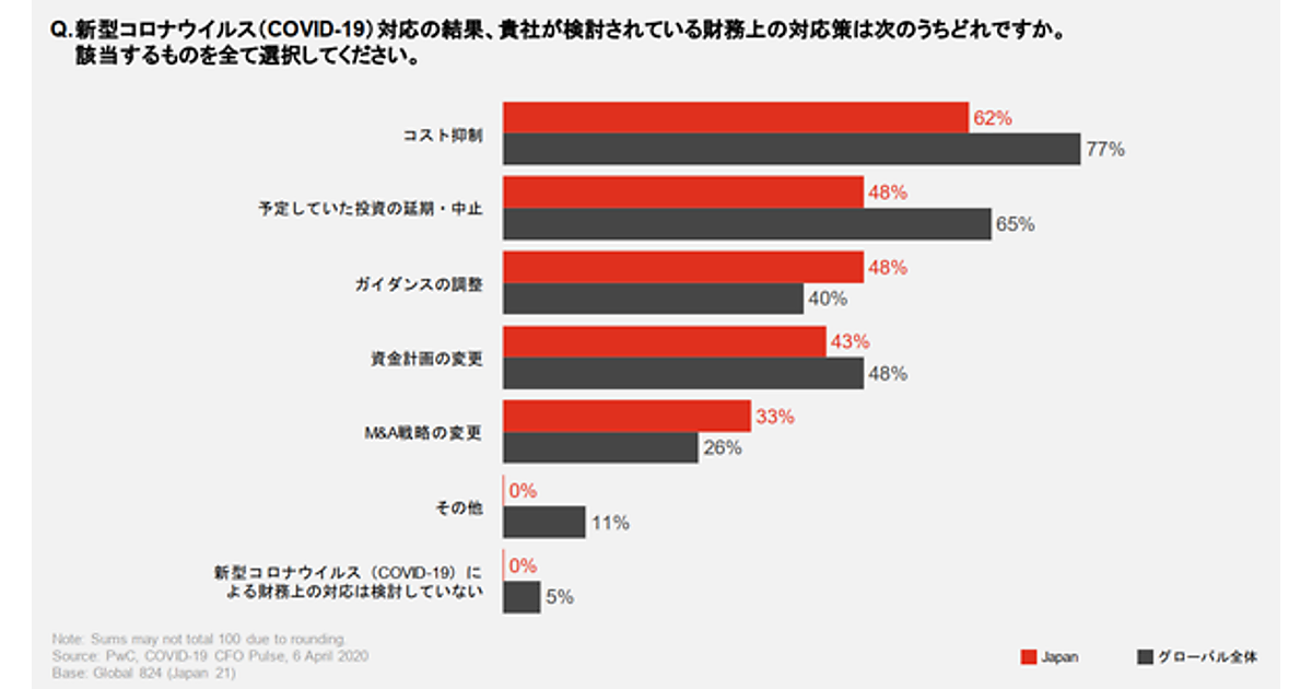 PwCグローバルネットワークは、新型コロナウイルス感染症(COVID-19)がビジネス・経済に与える影響を計るため、世界21か国のCFO(最高財務責任者)を対象に調査を実施した。事業活動への影響、今年の収益予想、財務上の対応策、投資やM&Aの戦略変更、最大の懸念などを聞いている。さらにPwC Japanが、日本とグローバルの比較を行っている。調査時期は2020年4月6日~11日で、日本を含む各国のCFO824名から回答を得た。