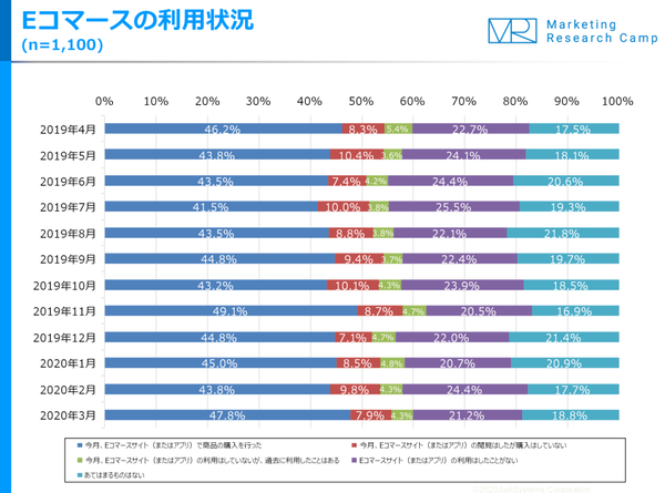 まず、Eコマースの利用状況を全員に聞くと、3月のEC利用率(商品購入を行った)は、47.8%。基本的にECの利用率は2019年4月以降すべて40%台だが、47.8%は2019年11月の49.1%に次ぐ高さで、比較的高い。