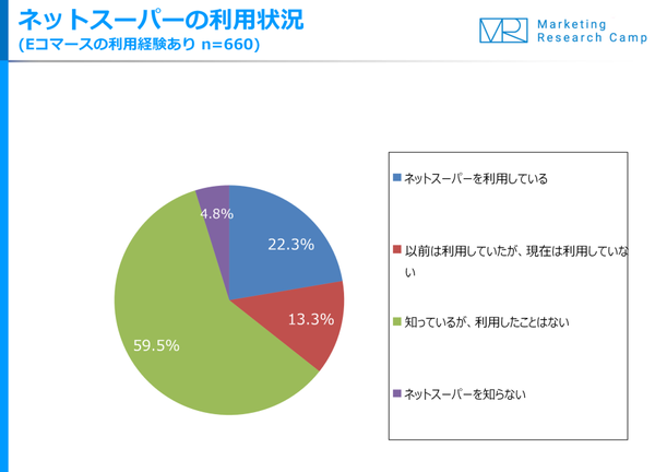 EC利用経験者(n=660)に、「ネットスーパーの認知・利用」について聞くと、「知っている」人は95.1%、「実際に利用している」人は22.3%だった(「知っている」=「ネットスーパーを利用している」+「以前は利用していたが、現在は利用していない」+「知っているが、利用したことはない」の合計)。