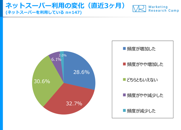 「利用している」人(n=147)に、「直近3か月での、ネットスーパーの利用頻度の変化」を聞くと、「増加した」28.6%、「やや増加した」32.7%、「どちらともいえない」30.6%、「やや減少した」6.1%、「減少した」2.0%となり、全体的に強く増加傾向が見られた。調査時期(2020年3月下旬)から、やはり新型コロナウイルスの影響と考えられる。