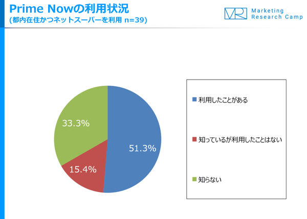 「Prime Now」は、生鮮食品を最短2時間で配送するAmazonのサービスで、現在は東京都17区で試験提供されている。そこで、都内在住のネットスーパー利用者(n=39)に「Prime Nowの利用状況」を聞くと、「利用したことがある」51.3%、「知っているが利用したことはない」15.4%、「知らない」33.3%で、過半数が使用経験があった。