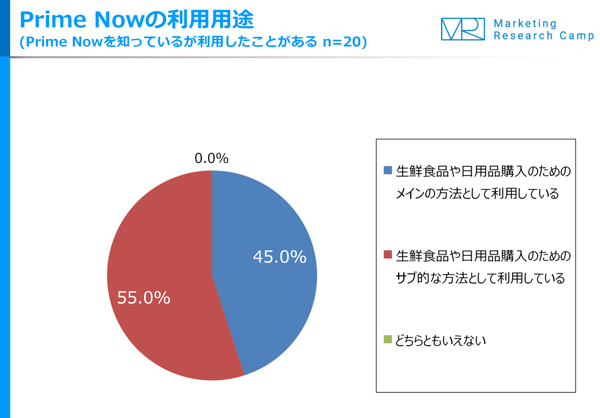 なお「Prime Now」の利用者(n=20)に「利用用途」を聞くと、「生鮮食品や日用品購入のためのメインの方法として利用している」45.0%、「生鮮食品や日用品購入のためのサブ的な方法として利用している」55.0%で、ほぼ両方に分かれた。