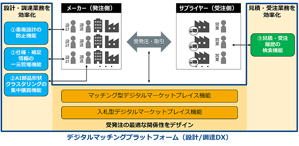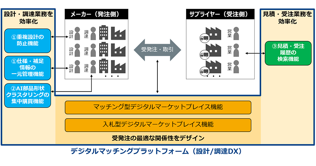 「さまざまな企業がつながる場を提供し、受発注の関係性を最適にデザイン」する機能も提供する。マッチング型と入札型の二つのデジタルマーケットプレイスを通じて、公開案件の見積回答などがスムーズになるので、メーカーの設計調達が効率化し、サプライヤー側は安定受注や設備の有効活用が期待できる。