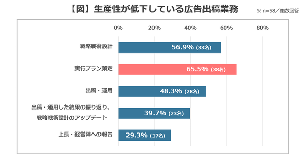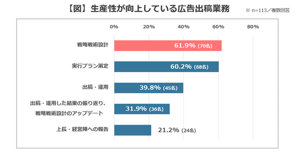 ただしこの2つは、「戦略戦術設計」が低下した(56.9%)、「実行プラン策定」が向上した(60.2%)の数字も多く、そもそもこの2つが広告出稿業務の中核だと考えられる。
