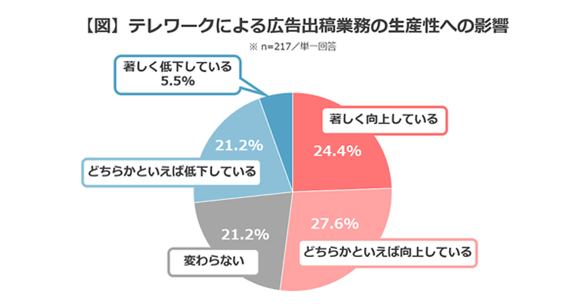 まず「テレワークによる広告出稿業務の生産性への影響」を聞くと、「著しく向上した」24.4%、「どちらかといえば向上している」27.6%で、合計52.2%が「向上した」と回答した。「変わらない」21.2%がいるため、「低下した」を「向上した」が大きく上回っており、肯定派が多いといえる。