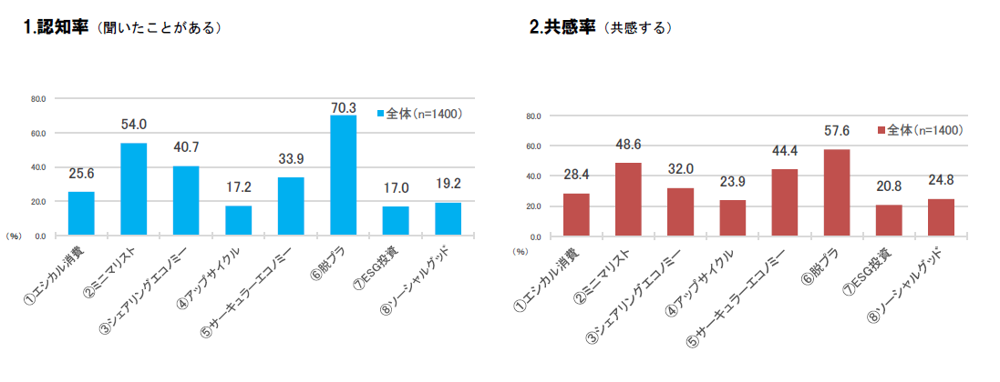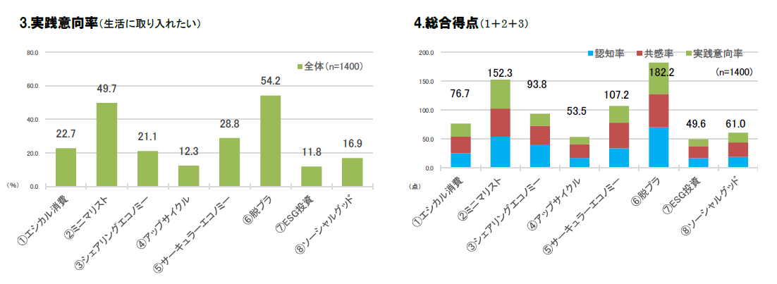 今回の調査では、SDGsに関連する行動として「エシカル消費」「ミニマリスト」「シェアリングエコノミー」「アップサイクル」「サーキュラーエコノミー」「脱プラ」「ESG投資」「ソーシャルグッド」の8つの行動様式・単語について、認知・共感・実践意向を聞いた。その結果、「脱プラ」 が認知率、共感率、実践意向率のいずれでもトップだった。認知率、共感率、実践意向率をポイント(pt)として合算すると、「脱プラ」182.2pt、「ミニマリスト」152.3pt、「サーキュラーエコノミー」107.2ptの順となった。