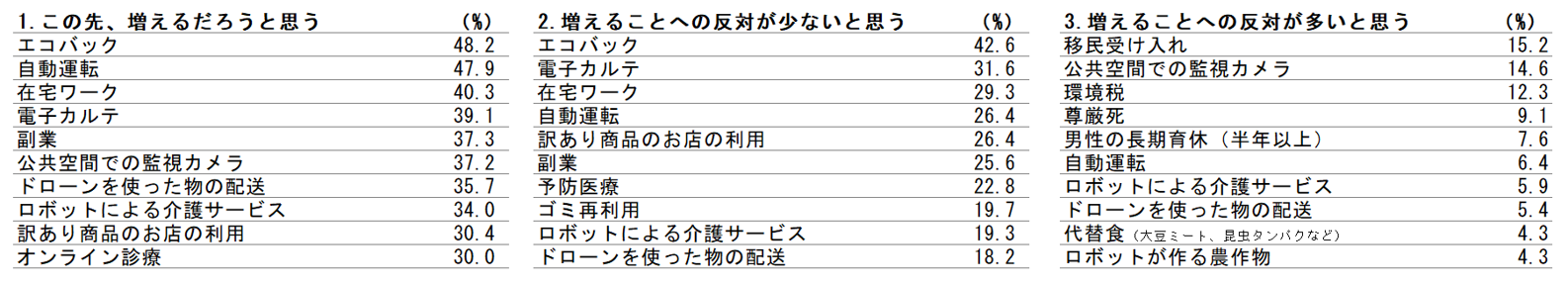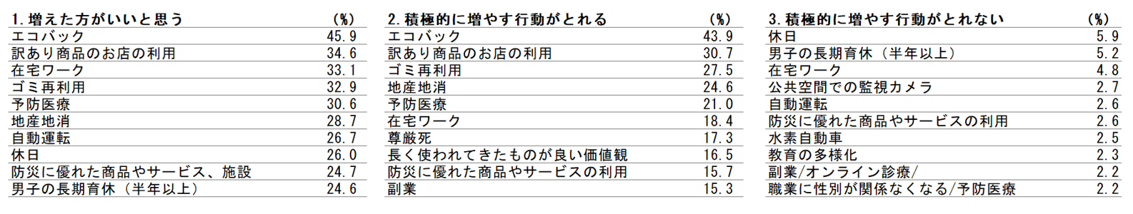 続いて、「SDG Industry Matrix」(産業別SDGsの手引き)の産業区分に基づき48項目を提示し、「この先増えるだろうと思うもの」を聞いた。その結果、社会的に増えそうなものは、「エコバッグ」48.2%、「自動運転」47.9%、「在宅ワーク」40.3%、「電子カルテ」39.1%、「副業」37.3%が上位となった。個人的に「この先、増えた方がいいと思うもの」 は、「エコバッグ」45.9%、「売れ残りなどの訳あり商品のお店」34.6%、「在宅ワーク」33.1%、「ゴミ再利用」32.9%、「予防医療」30.6%が上位だった。