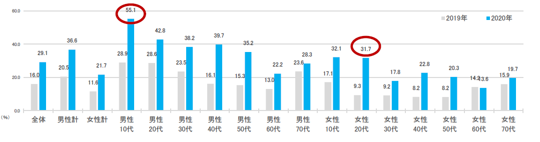 「SDGs」の認知率については、前回2019年調査の16.0%から、13.1pt上昇し29.1%。前々回→前回は1.2pt増だったのに比べると、この1年でSDGsの認知は急上昇したと言える。学生の認知は、前回の24.8%から45.1%とほぼ倍増している。性・年代別でも、女性60代を除く全年代で認知率が上昇していた。とくに男性10代(19年28.9%→20年55.1%、+26.2pt)、女性20代(19年9.3%→20年31.7%、+22.4pt)など、若年層・学生の上昇が目立つ。