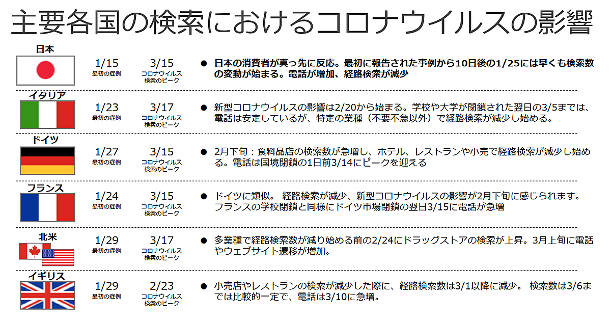 日本・イタリア・ドイツ・フランス・北米・イギリスの主要各国で比較すると、日本の消費者が真っ先に反応していた。1月15日に最初の症例が報告されたが、1月25日には食料品店など主要業界に関する検索数が大幅に増加。2月29日には想定レベルの307%増のピークに達した。
