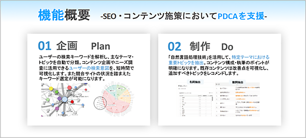 キーワードリサーチ機能を使うと、ターゲット層の検索意図やニーズに沿ったキーワードの分析が可能なるほか、自社サイト・ページが顧客ニーズに応えられているかどうかや、競合サイトとの差がどの程度あるかが分析できる。サイトへの流入を増やすためのコンテンツ制作の方針も分かる。申し込み後、アカウント開設や設定を案内する。