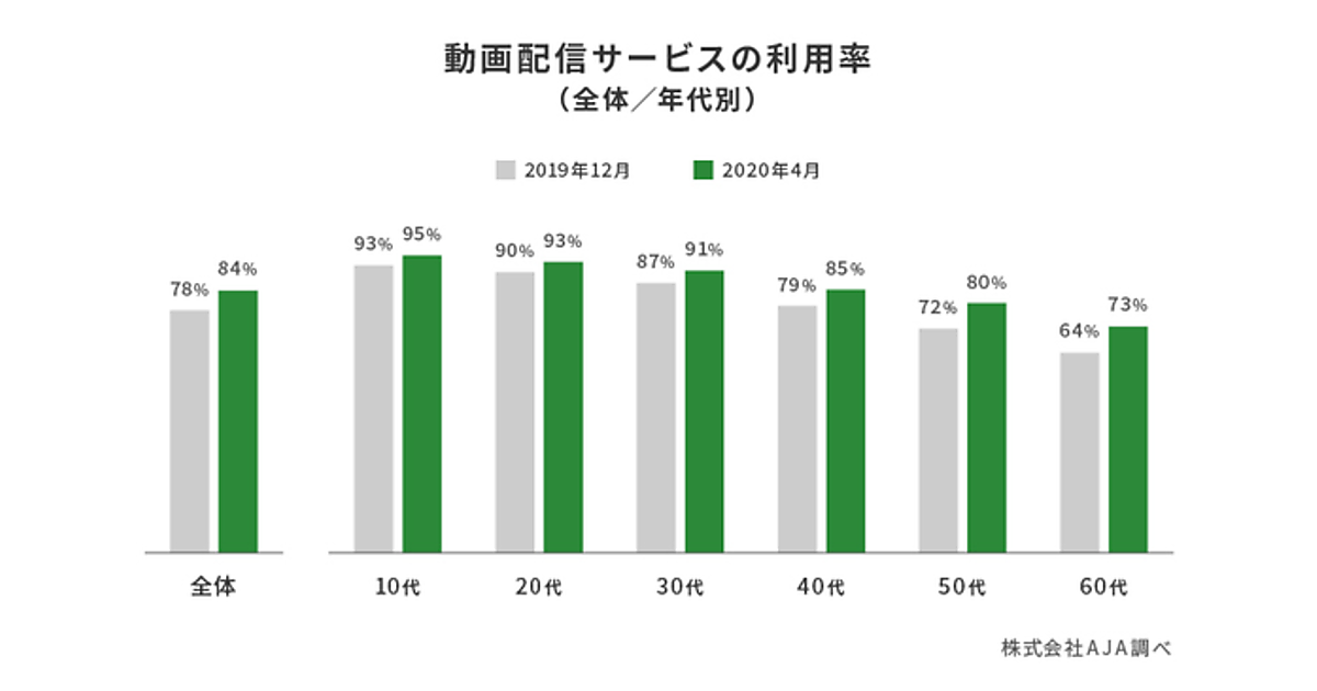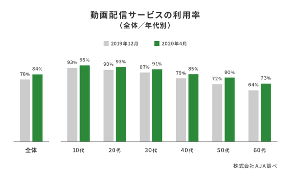 新型コロナウイルス拡大の影響で在宅時間が増加しており、「動画配信サービス」の利用増が推測される。今回の調査によると、動画配信サービスの利用率は、全体の84%。2019年12月の78%から6ポイント増加していた。